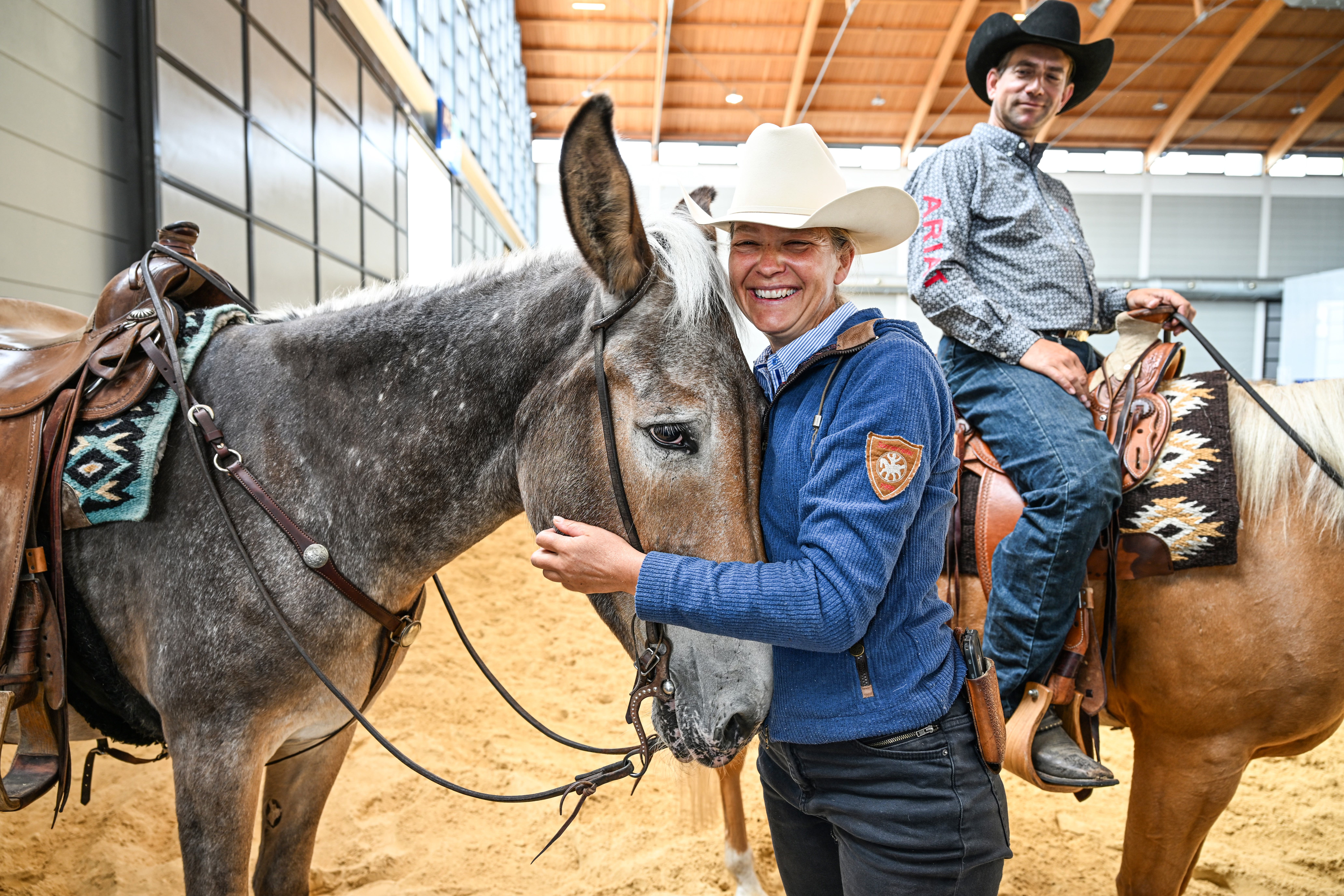 From the very beginning, Americana has been a pioneer of western riding, and the show management came up with some important details to promote the sport again this year. The action in the arena was recorded from four camera positions and broadcast on five large screens, so that every spectator could follow the action perfectly at all times. In addition, there were dynamic slow-motion shots, as seen in other sports. It was a great idea to project the scores of each individual manoeuvre in the Open Bronze Trophy Final onto the screens – making reining understandable, so to speak. The spectators were also introduced to cutting, and before the Super Ranch Horse, Diana Royer rode her mule Fine through the pattern in a very entertaining manner. The Americana show management had also taken further measures to ensure safety in the cattle disciplines. The entire show arena had been raised by 20 cm, so that the side panels were now 2 m high. Combined with rounded corners and kick pads on the walls, this meant an additional plus for animal welfare, which also impressed the official veterinarians on site.
